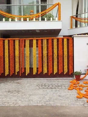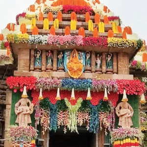 🌸 Floral arrangements, fabric drapes, and traditional lighting for medium temples.